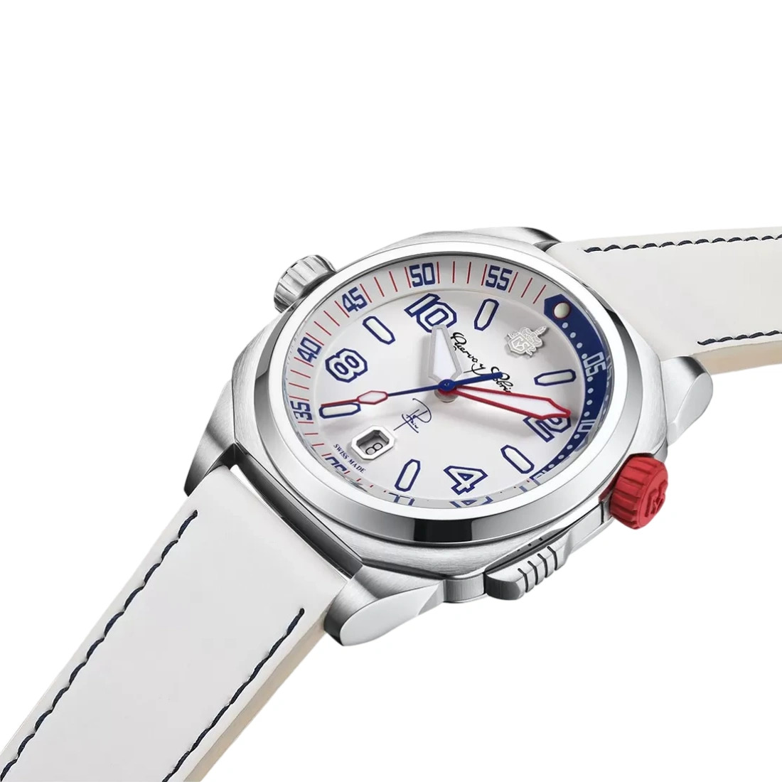 Horas, minutos y segundos revestidos con Super-LumiNova® blanco, minutos rojos, horas plateadas y segundos azules
