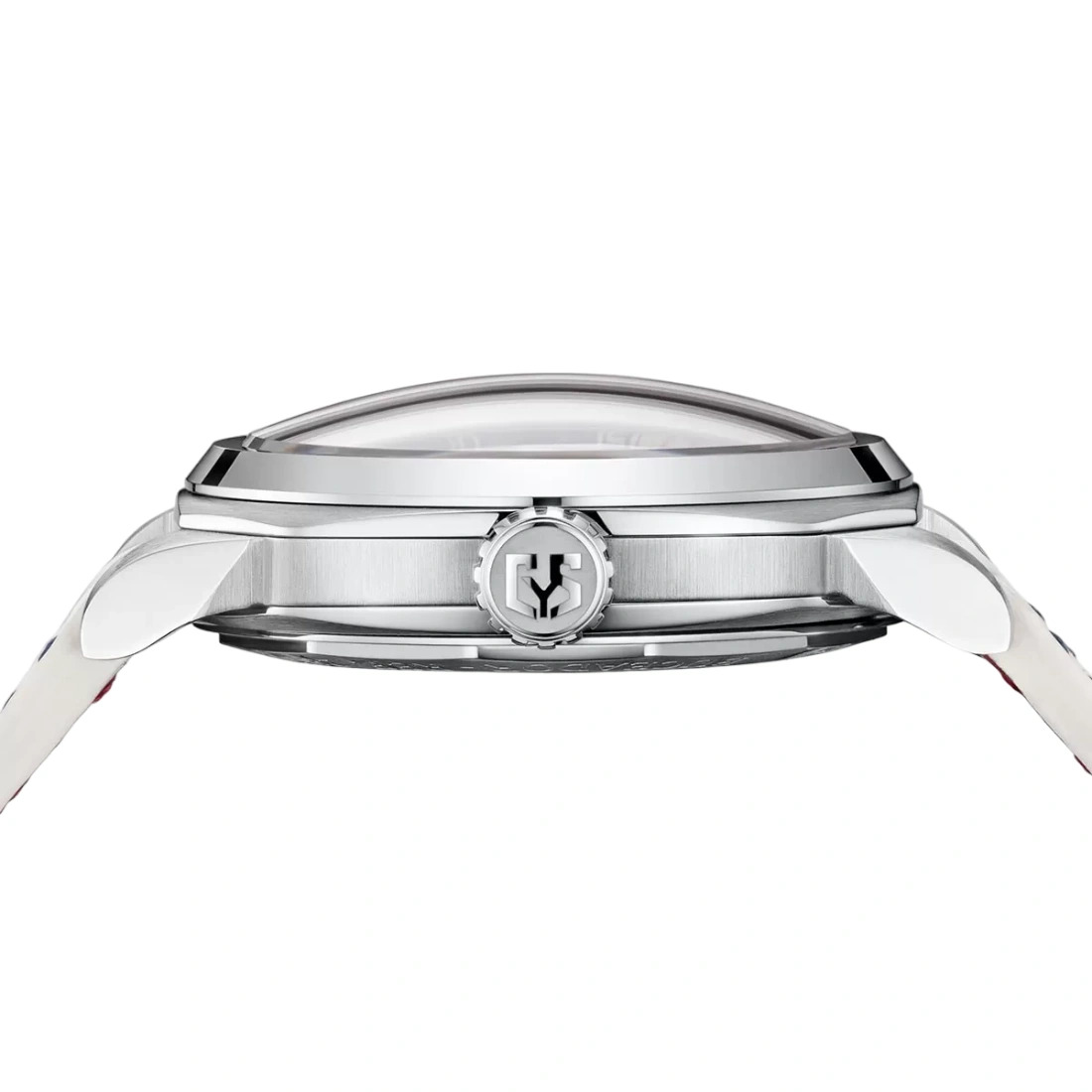 2 hebillas de acero inoxidable (una para la correa de caucho y otra para la correa de cuero). Ambas llevan grabado el emblema CyS.