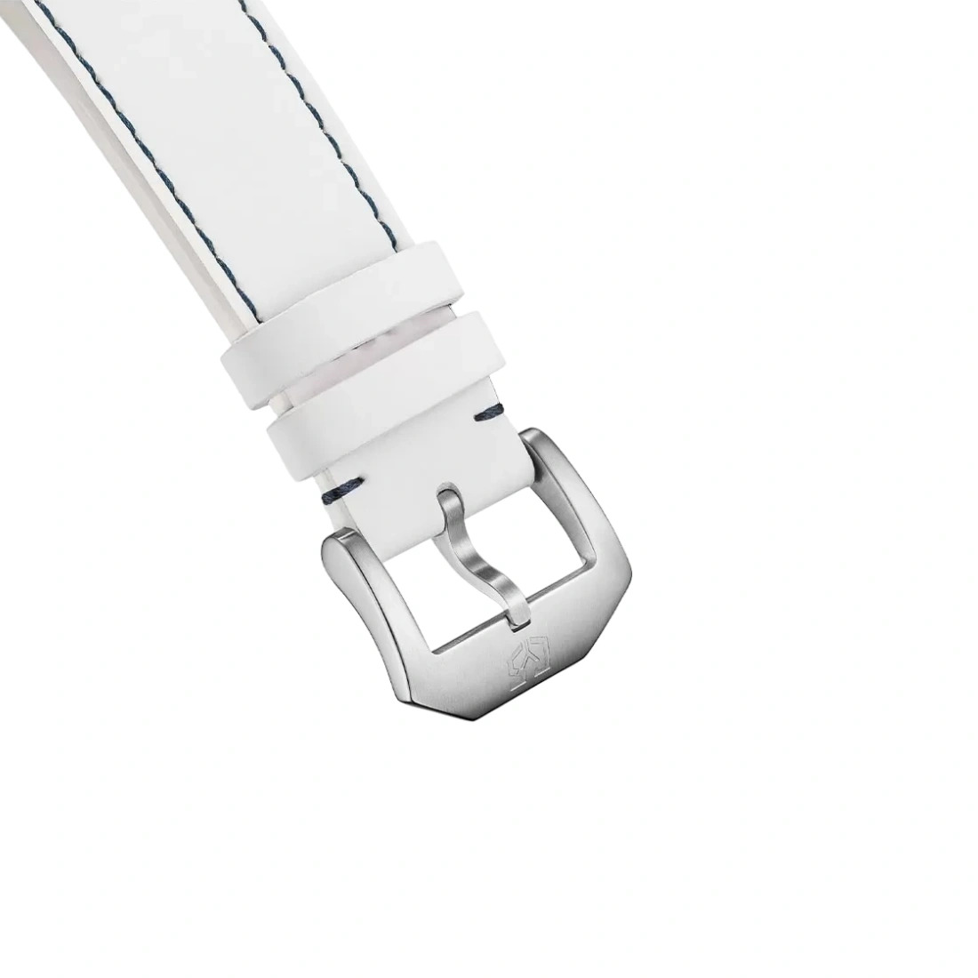 Caucho blanco de alto brillo, se suministra una correa adicional en cuero azul.