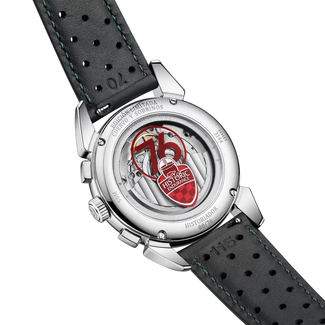 Acero inoxidable diámetro 40 mm altura 12,45 mm cristal de zafiro de doble curvatura con revestimiento antirreflectante resistente al agua hasta 5 ATM. Fondo de caja transparente atornillado con cristal de zafiro adornado con el texto "Historic Endurance 76"