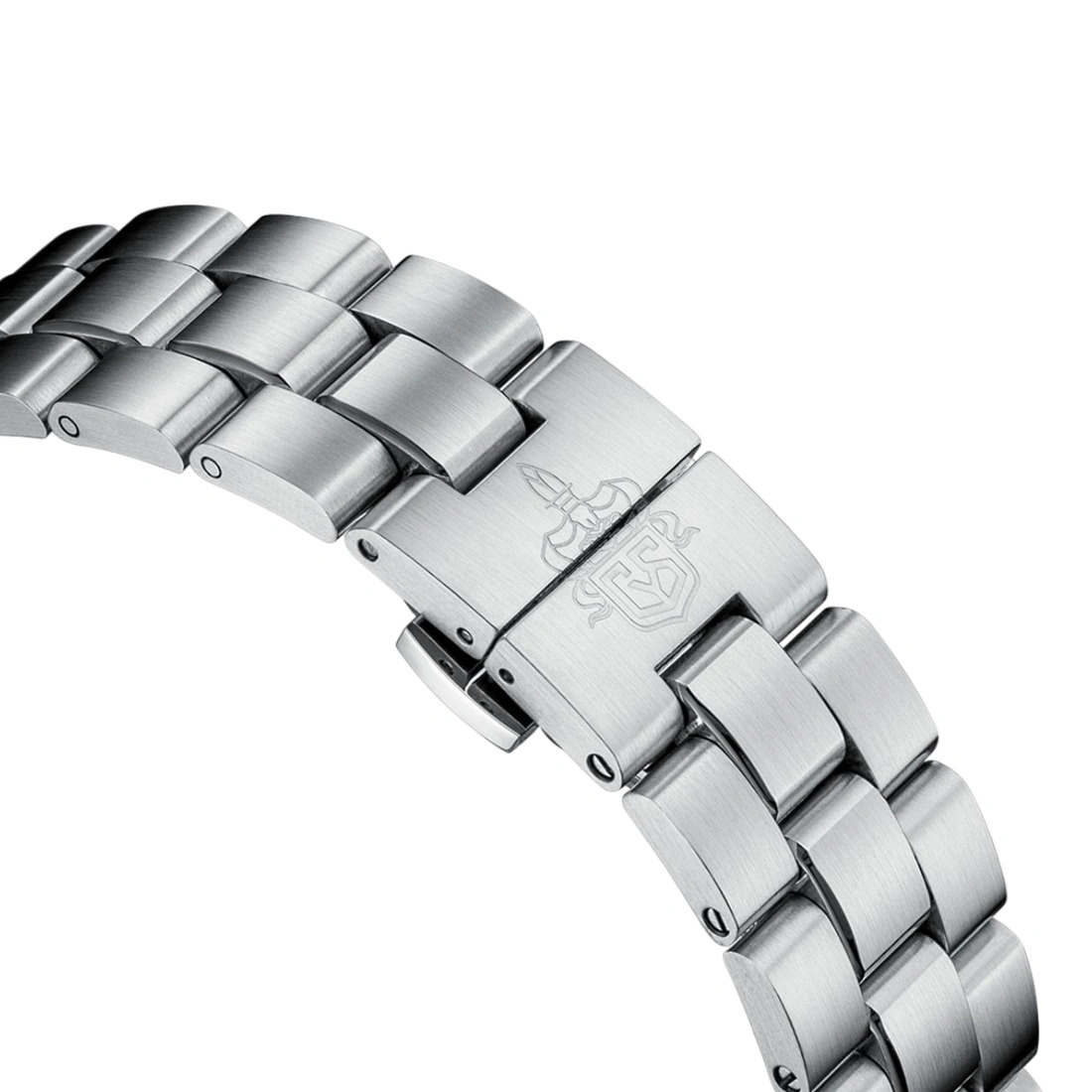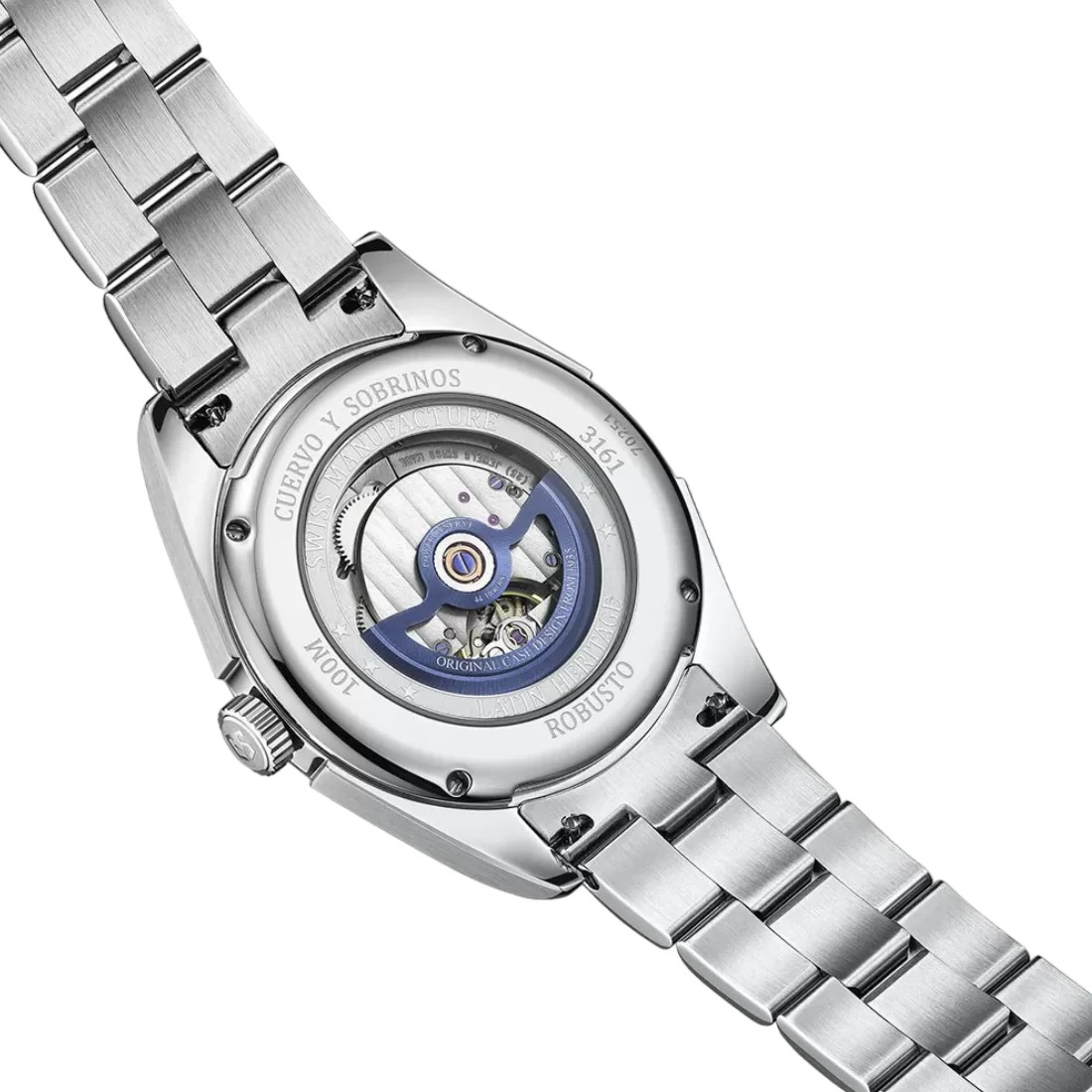 Acero inoxidable Diámetro 40 mm Altura 11,85 mm Cristal de zafiro de doble curvatura con revestimiento antirreflejos Resistente al agua hasta 10 ATM Fondo de caja transparente Masa oscilante calada de color azul con inscripción 'ORIGINAL CASE DESIGN FROM 1935'