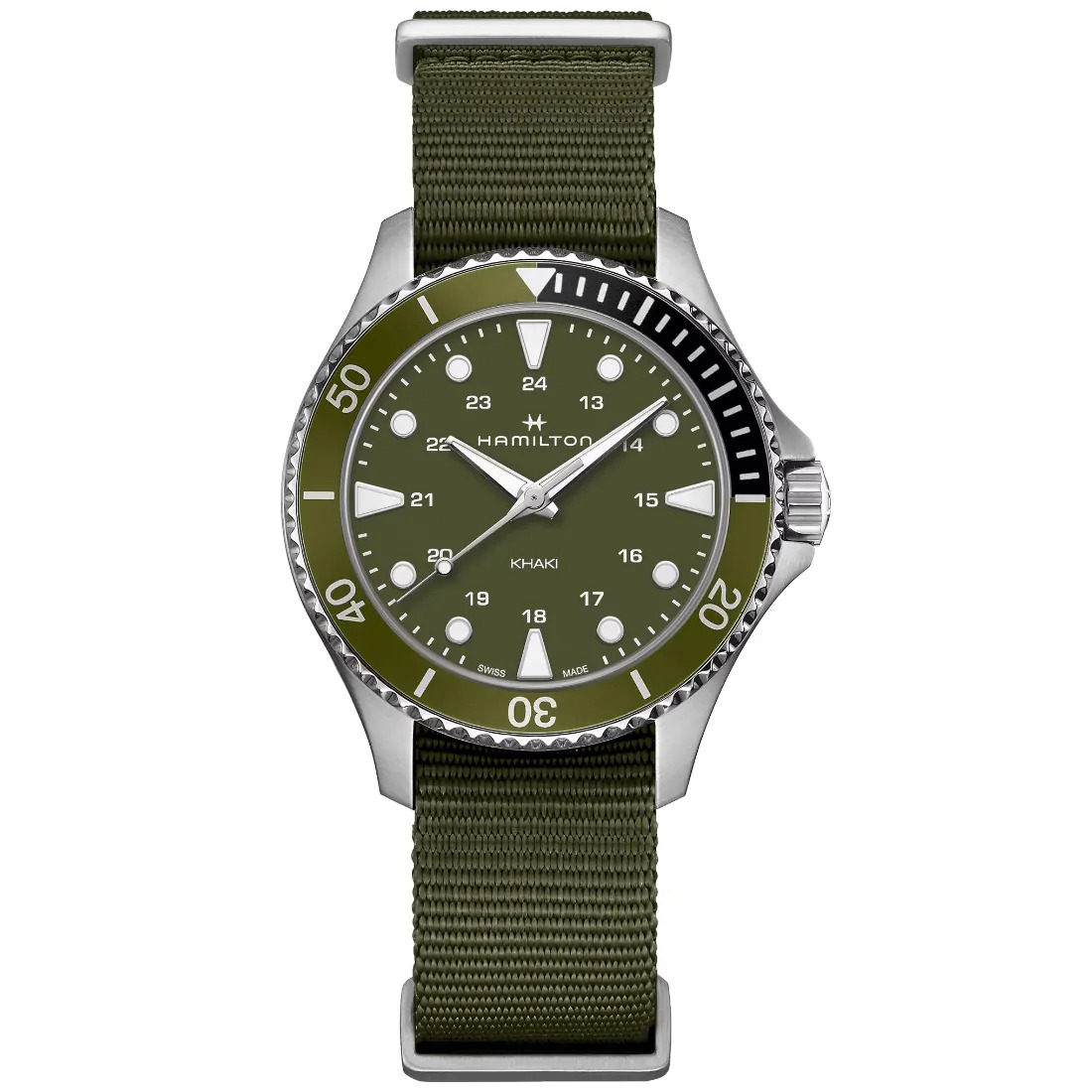 El Reloj Khaki Navy Scuba Quartz de 37 mm, con un tamaño que se adapta a casi cualquier muñeca, presenta un diseño totalmente verde, con un bisel unidireccional de aluminio, una esfera ultralegible y una correa NATO de textil. Las agujas y los índices de la hora de la esfera verde militar intenso están revestidos de Super-LumiNova® para una legibilidad óptima. La atractiva paleta de tonos verdes presente en todo el modelo hace del Khaki Navy Scuba un compañero atemporal frente a cualquier desafío, desde exploraciones acuáticas hasta aventuras urbanas.
