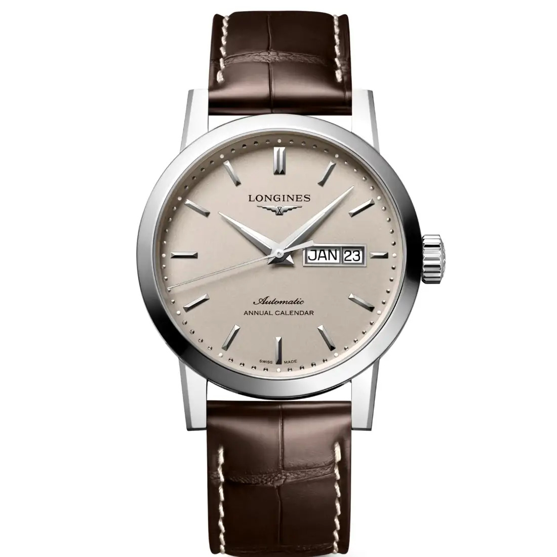 Color Esfera: Beige Círculo Horario: Índices aplicados Agujas: Agujas plateadas pulidas Características: Swiss Super-LumiNova