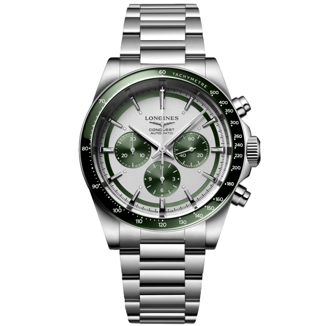 Color esfera: Plateada mate con contadores verdes Círculo horario: Índices aplicados Agujas: Agujas plateadas pulidas Características: Swiss Super-LumiNova