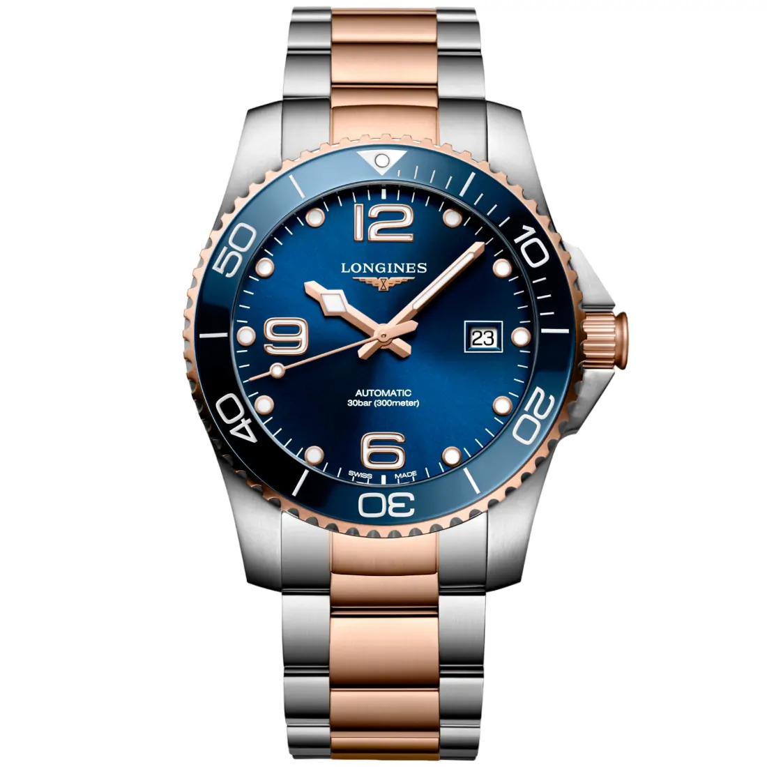 Color esfera: Azul con efecto "rayos de sol" Círculo horario: Índices y números árabes aplicados Agujas: Agujas rosa Características: Swiss Super-LumiNova®