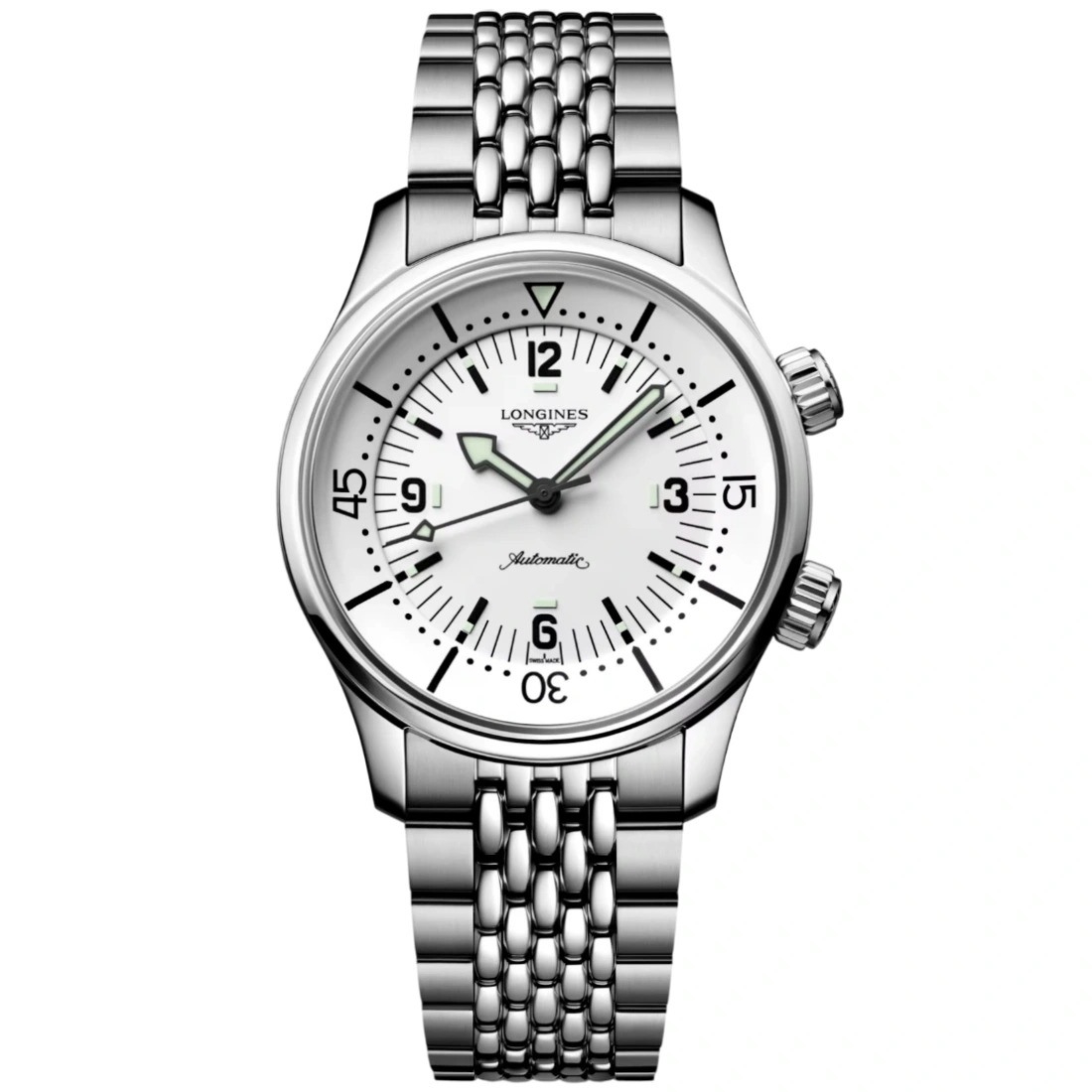 Color esfera: Blanco mate Círculo horario: Índices y números árabes pintados Agujas: Agujas plateadas Características: Swiss Super-LumiNova