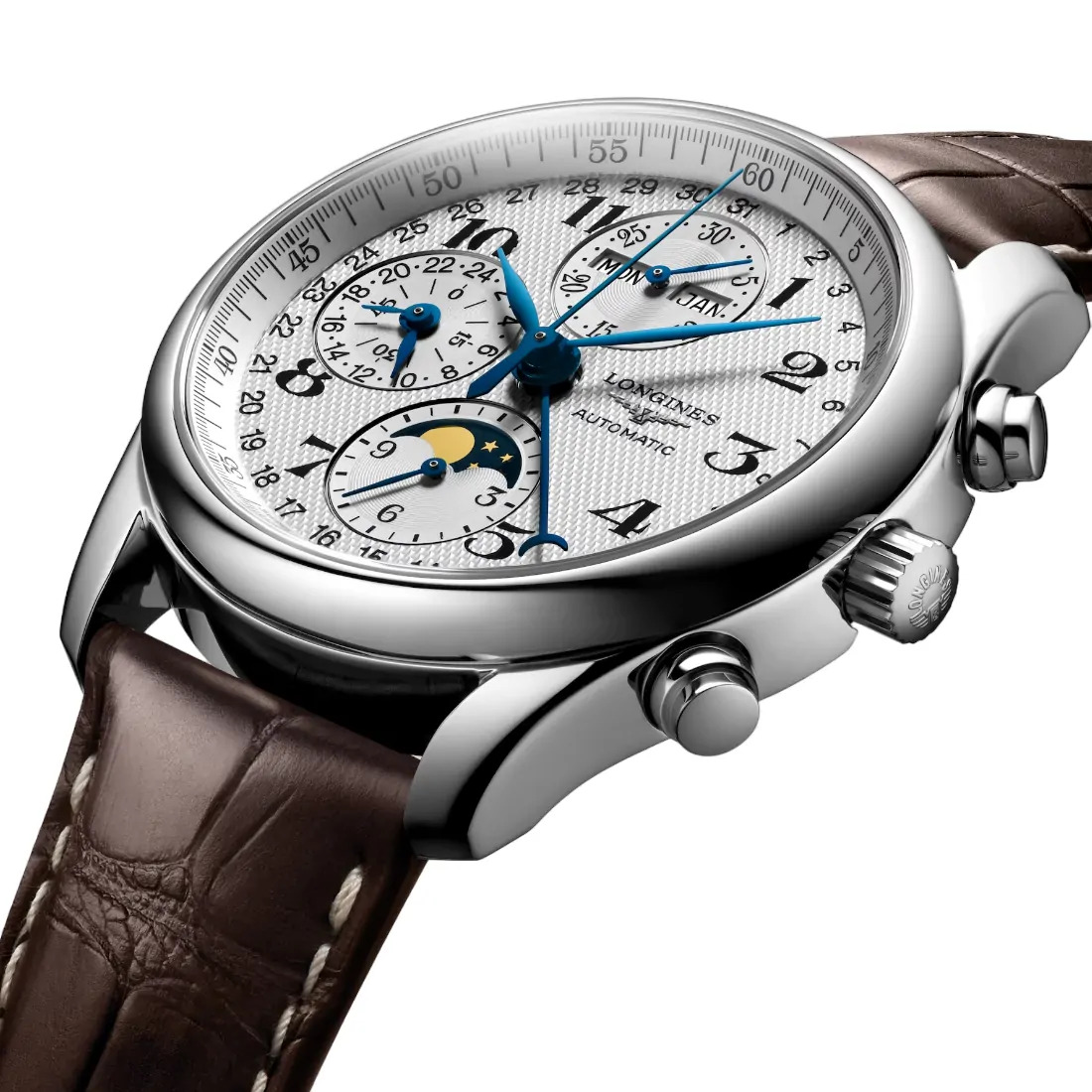 Tipo de movimiento: Automático Función: Horas, minutos, segundero pequeño con indicador de 24 horas a las 9. La fecha está indicada por una aguja central con forma de medialuna. Indicación de fases de la luna a las 6. Calibre: L687 Descripción del movimiento: Movimiento mecánico automático, 28.800 alternancias por hora y 66 horas de reserva de marcha aproximadamente Función especial: Fases de la luna Cronógrafo: Cronógrafo de rueda de pilares Funciones de cronógrafo: Mecanismo cronógrafo: segundero central de cronógrafo, indicación de la fase de la luna con contador de 12 horas a las 6, contador de 30 minutos con indicación de día y mes a las 12