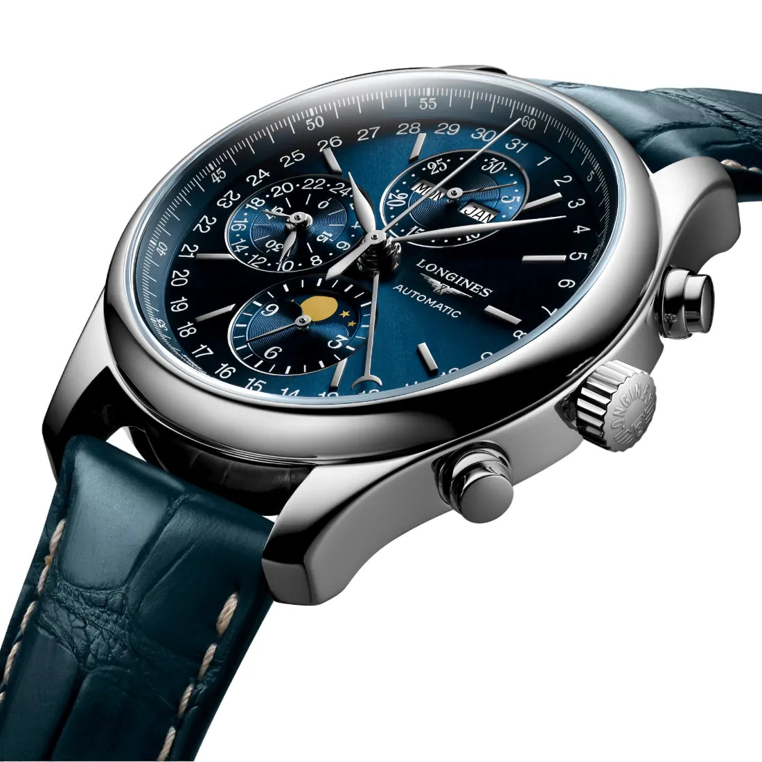 Tipo de movimiento: Automático Función: Horas, minutos, segundero pequeño con indicador de 24 horas a las 9. La fecha está indicada por una aguja central con forma de medialuna. Indicación de fases de la luna a las 6. Calibre: L687 Descripción del movimiento: Movimiento mecánico automático, 28.800 alternancias por hora y 66 horas de reserva de marcha aproximadamente Función especial: Fases de la luna Cronógrafo: Cronógrafo de rueda de pilares Funciones de cronógrafo: Mecanismo cronógrafo: segundero central de cronógrafo, indicación de la fase de la luna con contador de 12 horas a las 6, contador de 30 minutos con indicación de día y mes a las 12