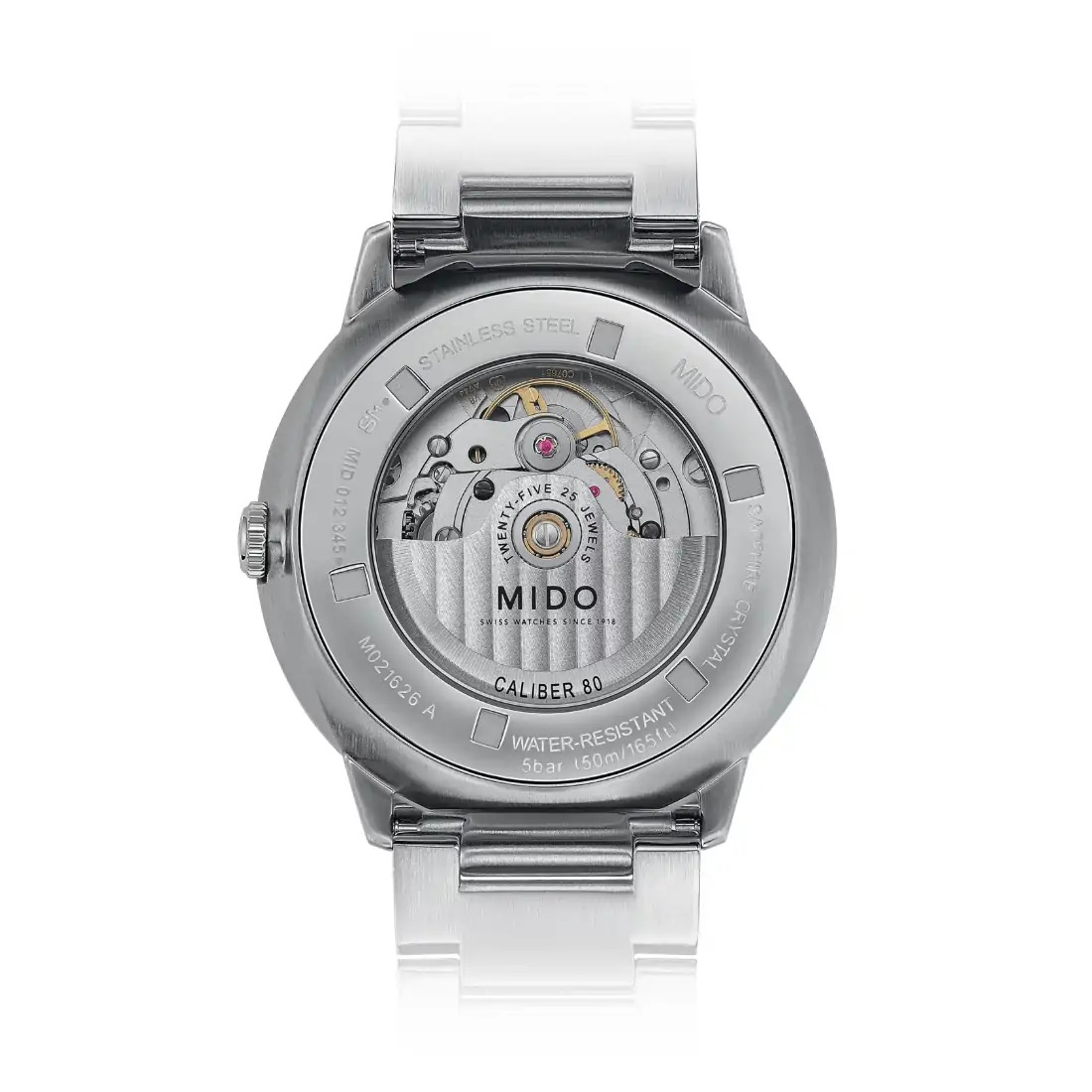 Funciones: Gran fecha Calibre: Automático Mido Calibre 80 (base ETA C07.651) Movimiento: Mido Automático Reserva de marcha: Reserva de marcha de hasta 80 horas Diámetro movimiento (mm): 28.80 Joyas:25 Calibre: 12.75