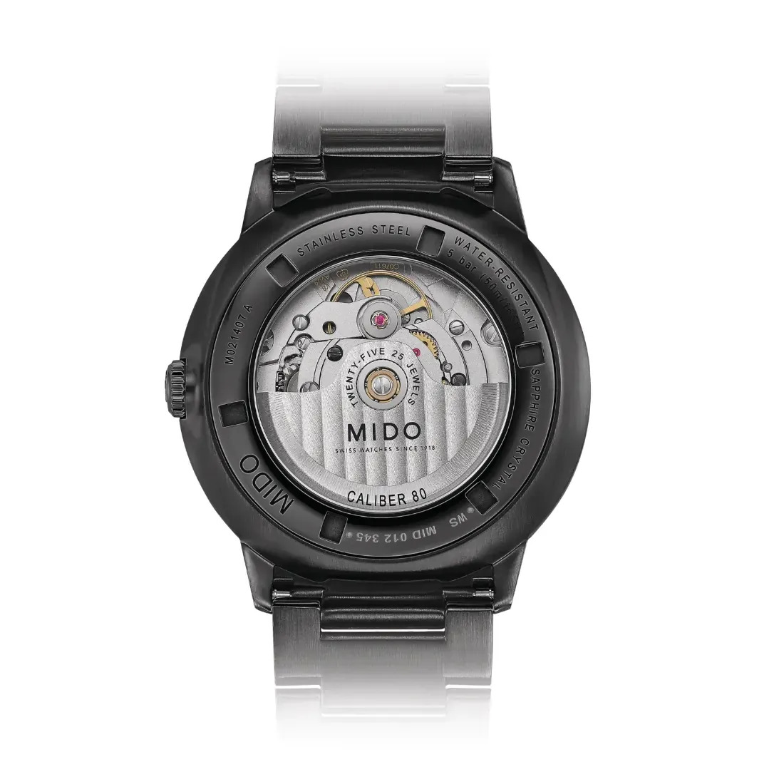 Funciones: Fecha Calibre: Automático Mido Calibre 80 (base ETA C07.611) Movimiento: Mido Automático Reserva de marcha: Reserva de marcha de hasta 80 horas Diámetro movimiento (mm): 25.60 Joyas: 25 Calibre: 11.5