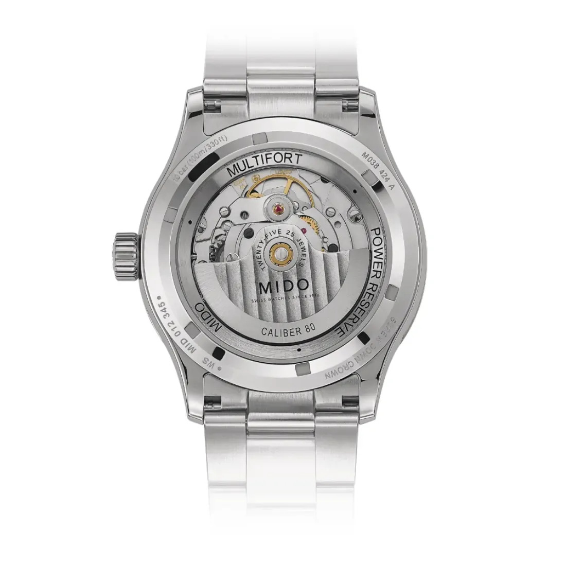 Funciones: Fecha, Reserva de marcha Calibre: Automático Mido Calibre 80 (base ETA C07.671) Movimiento: Mido Automático Reserva de marcha: Reserva de marcha de hasta 80 horas Diámetro movimiento (mm): 25.60 Joyas: 25 Calibre: 11.5