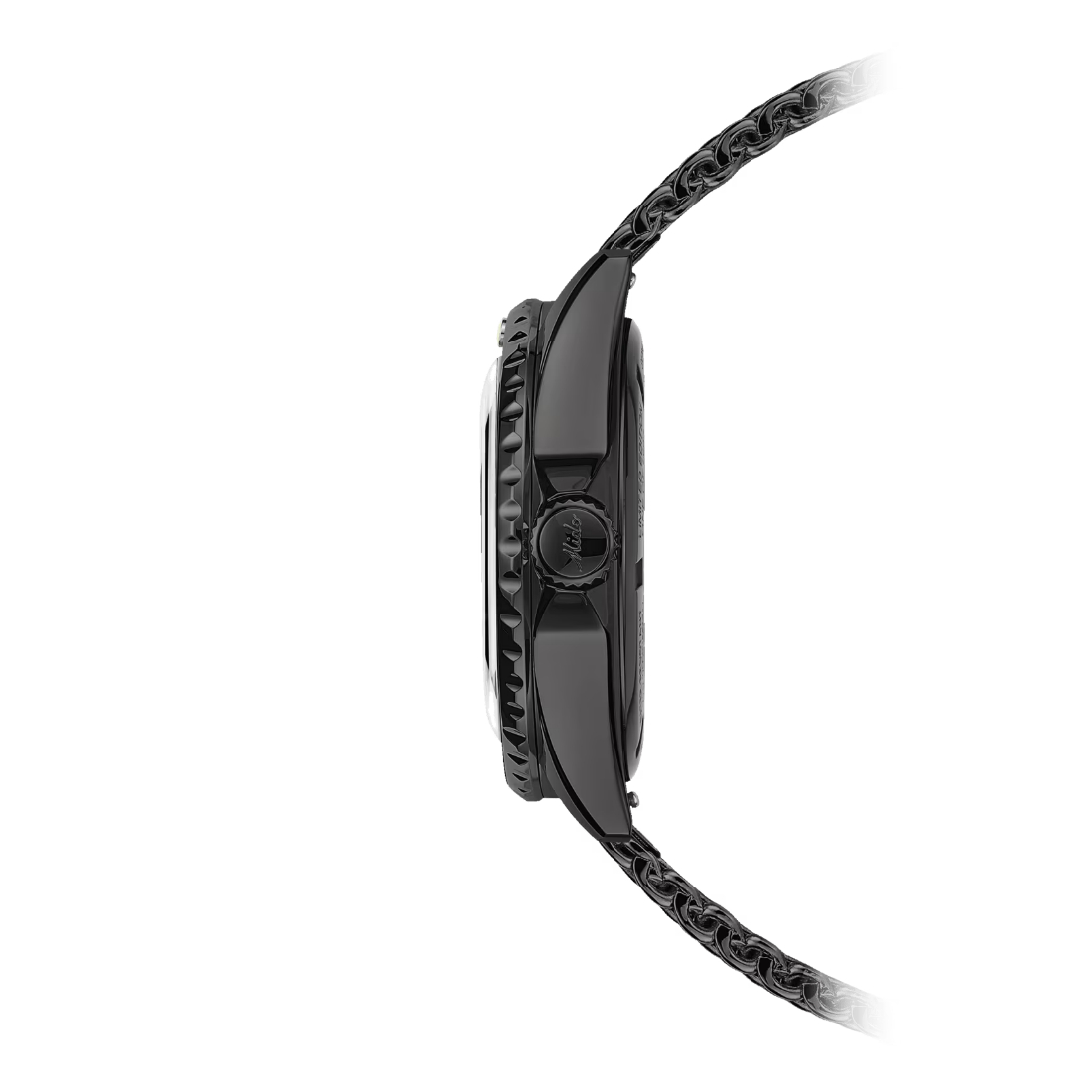 Forma de la caja: Redondo Longitud: 40.50 Anchura: 40.50 Espesor Medio (mm): 13.4 Astas: 21.00 Material de la caja: Acero inoxidable con recubrimiento PVD negro Cristal: Cristal zafiro Opciones de la caja: Corona atornillada