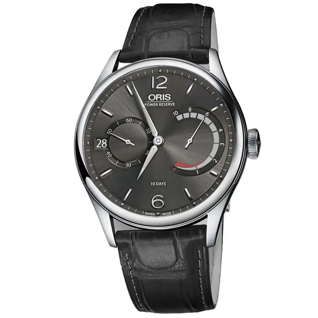 NÚMERO Oris 111 DIMENSIONES Ø 34.00 mm, 15''' FUNCIONES Agujas centrales para horas y minutos, segundero subsidiario a las 9 h, indicación reserva de marcha no lineal a las 3 h, ventanilla fecha, corrector fecha, cronometrador de precisión y paro segundo REMONTE Remonte manual RESERVA DE MARCHA 240 h VIBRACIONES 21’600 A/h, 3 Hz RUBÍES 40