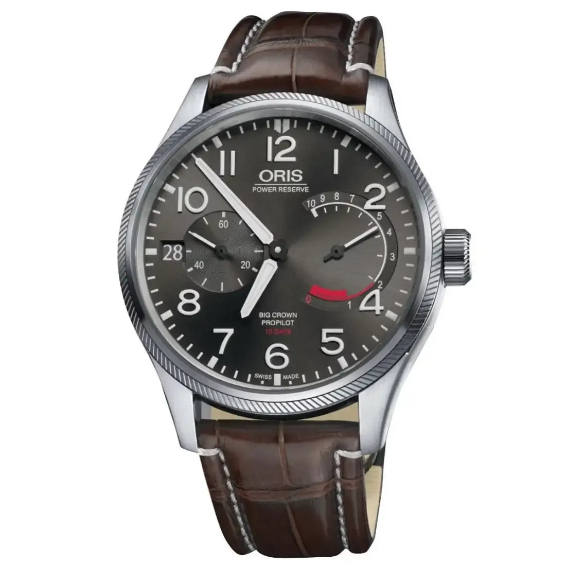 NÚMERO Oris 111 DIMENSIONES Ø 34.00 mm, 15''' FUNCIONES Agujas centrales para horas y minutos, segundero subsidiario a las 9 h, indicación reserva de marcha no lineal a las 3 h, ventanilla fecha, corrector fecha, cronometrador de precisión y paro segundo REMONTE Remonte manual RESERVA DE MARCHA 240 h VIBRACIONES 21’600 A/h, 3 Hz RUBÍES 40