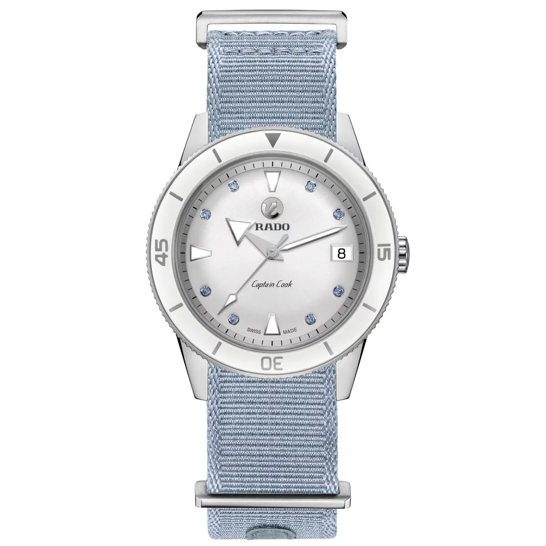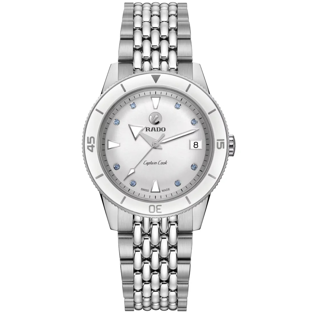 Color de la esfera: Blanco Indicador de fecha en la esfera Joyas en la esfera 8 zafiros de color azul hielo
