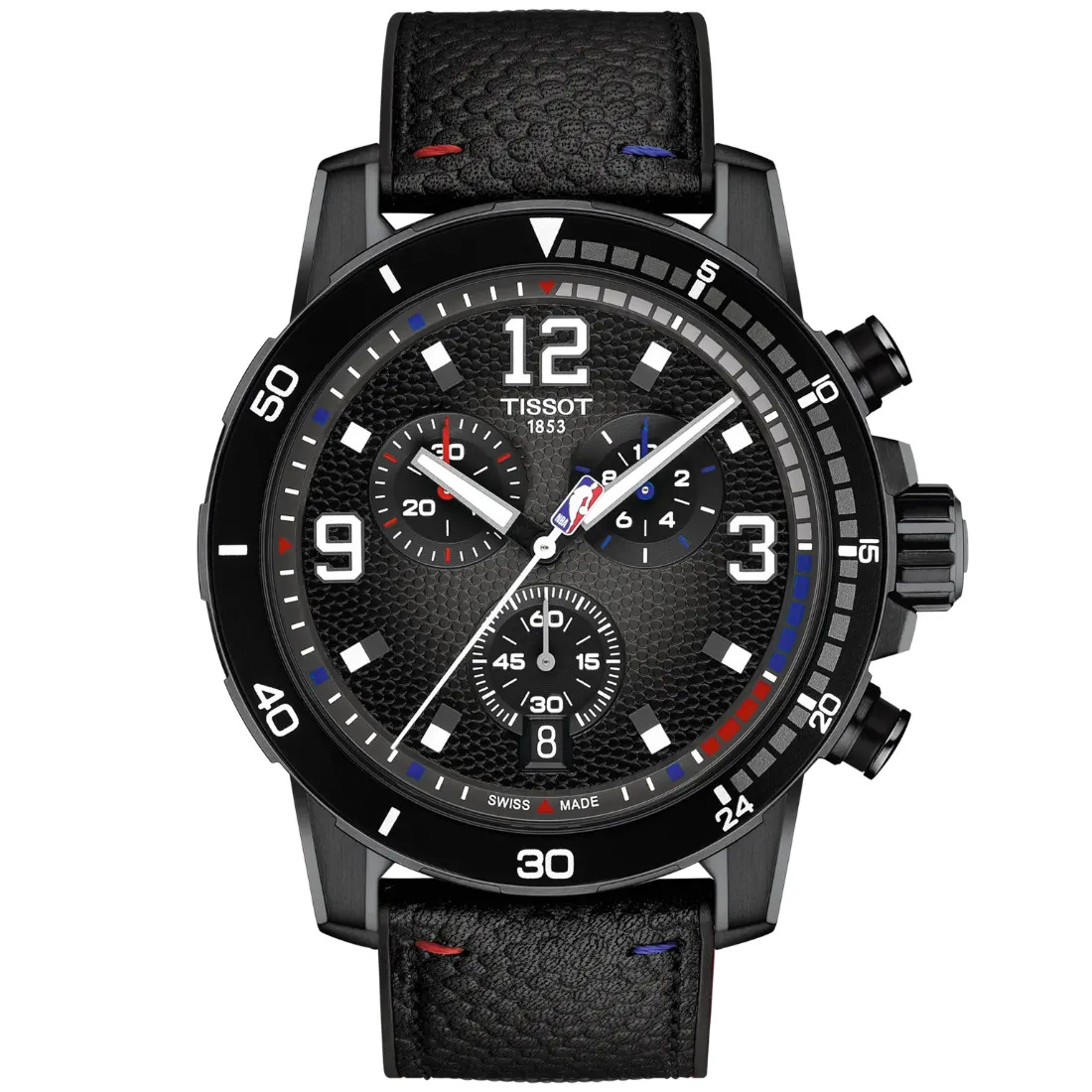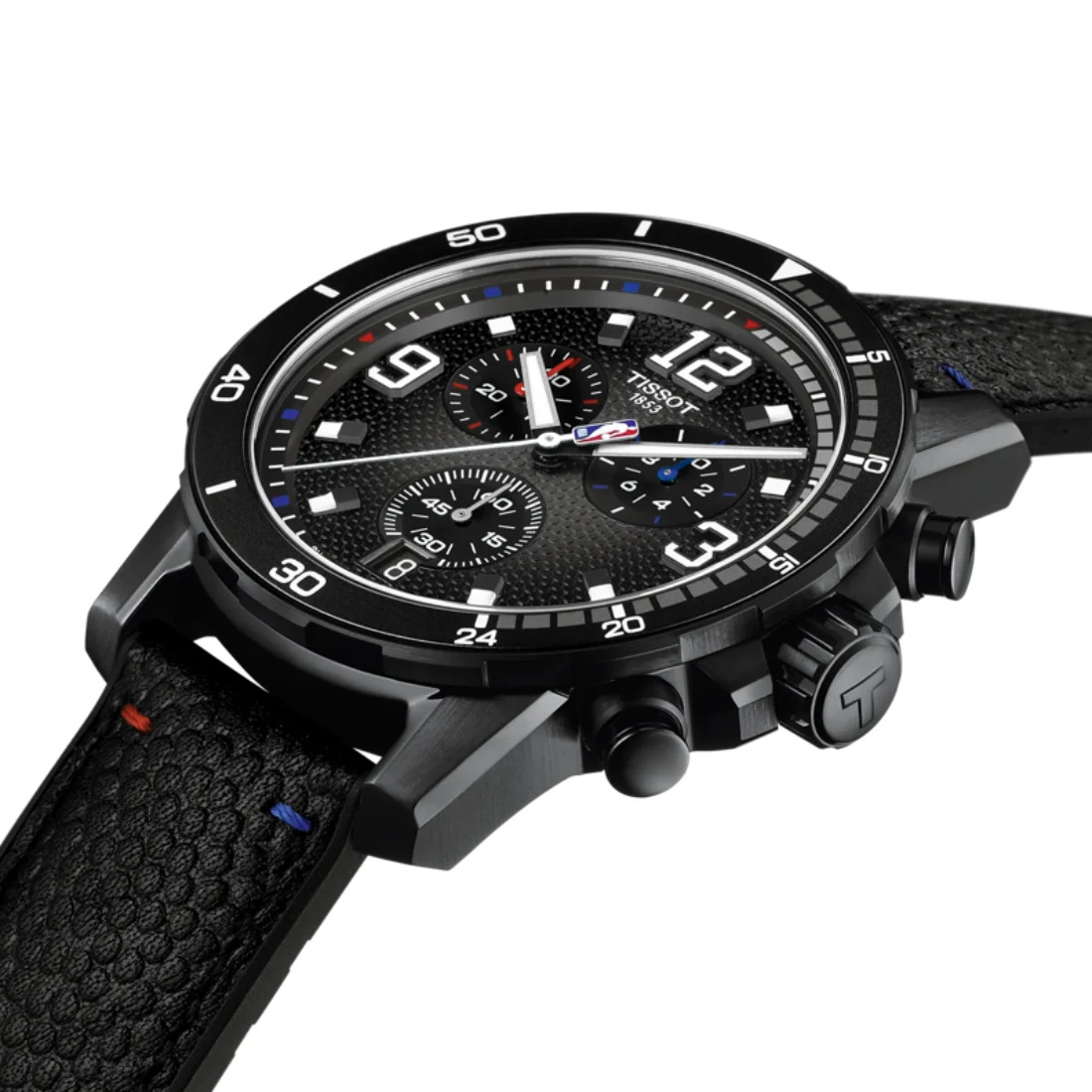 El NBA Supersport Special Edition rinde homenaje al baloncesto con detalles bien cuidados y un estilo deportivo. La llamativa caja de 45 mm de acero inoxidable con revestimiento de PVD negro presenta un bisel que incorpora la regla de los 24 segundos, inspirada en el reloj de tiro de la NBA, con detalles de color que aluden a la liga.