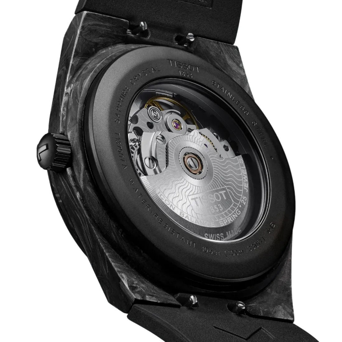 Longitud: 40,00 Anchura: 40,50 Grosor: 11,23 Astas: 12.00 Hermeticidad: Hermético hasta una presión de 10 bares (100 metros/330 pies) Forma de la caja: Forma de barril Material de la caja: Caja de carbono forjado jaspeado en negro y gris con fondo de acero inoxidable 316L con revestimiento de pvd negro Opciones de la caja: Fondo de caja transparente Cristal: Cristal de zafiro con revestimiento antirreflejos