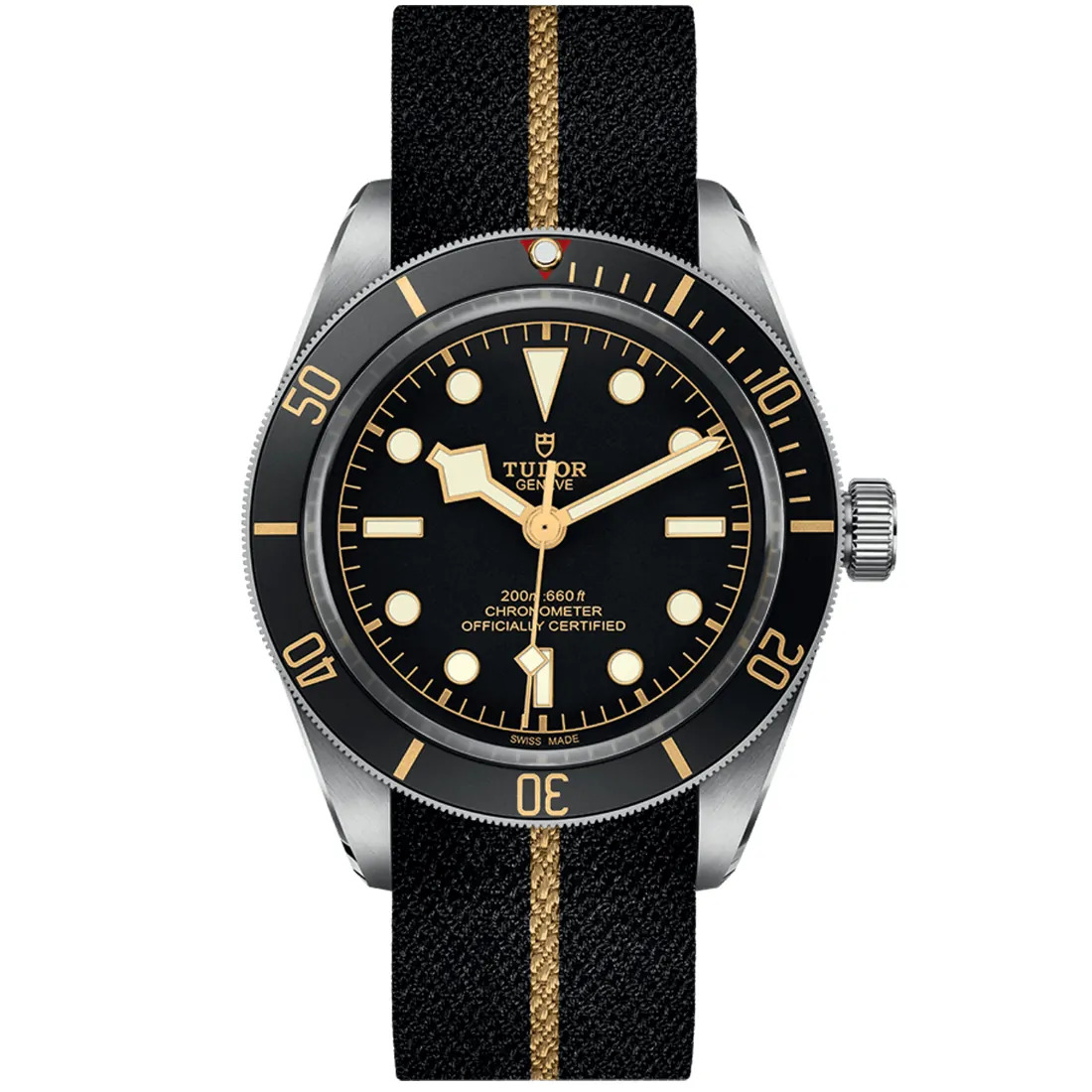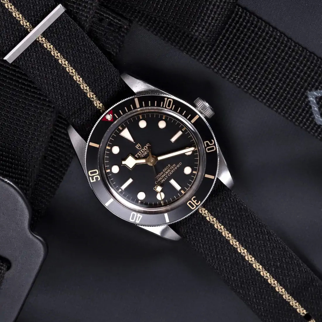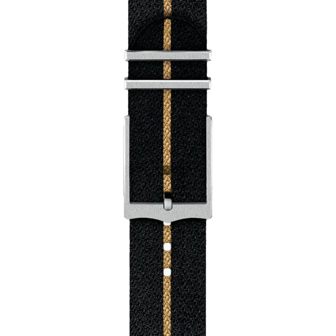 Correa de tejido negra y beige con banda dorada y cierre de hebilla